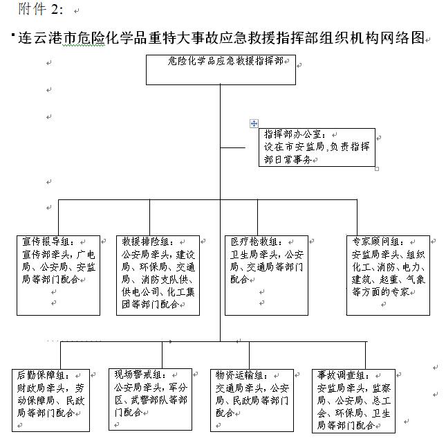 为确保应急救援工作迅速、有效、顺利开展,应急救援指挥部下设八个专业组,即:宣传报道组、救援排险组、医疗抢救组、专家顾问组、后勤保障组、现场警戒组、物资运输组、事故调查组。详见“连云港市危险化学品重特大事故应急救援指挥部组织机构网络图”(附件2)。